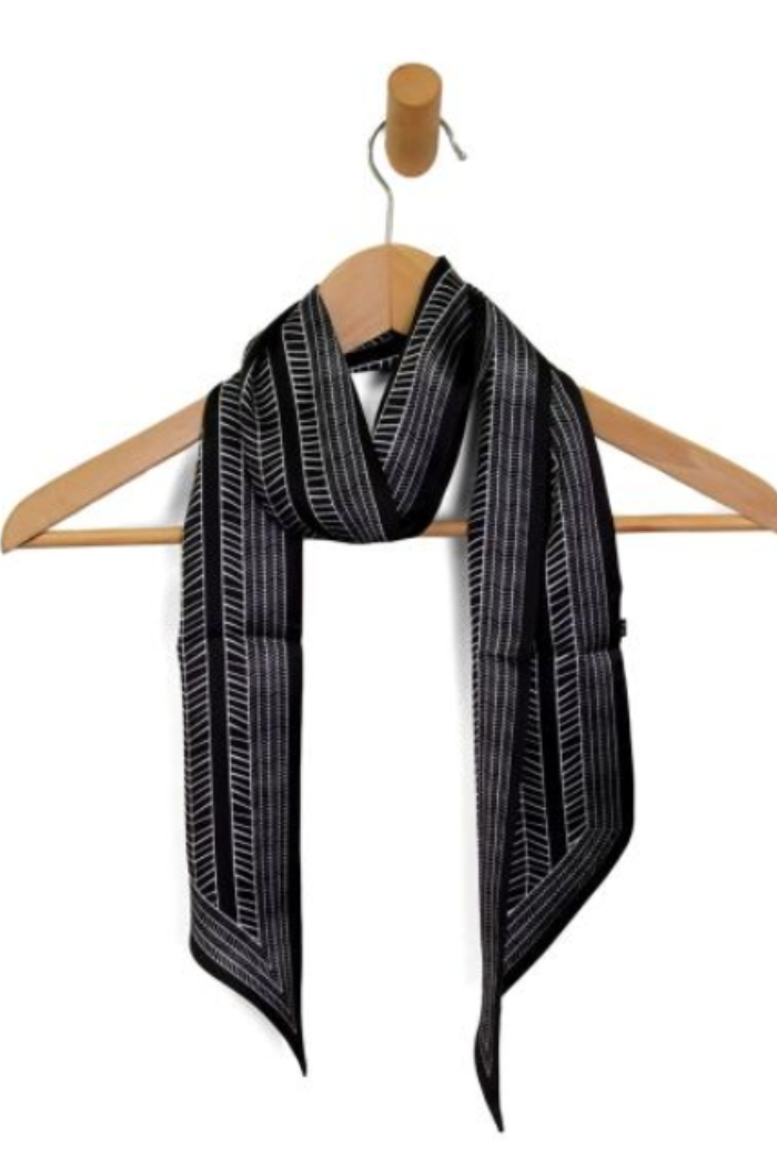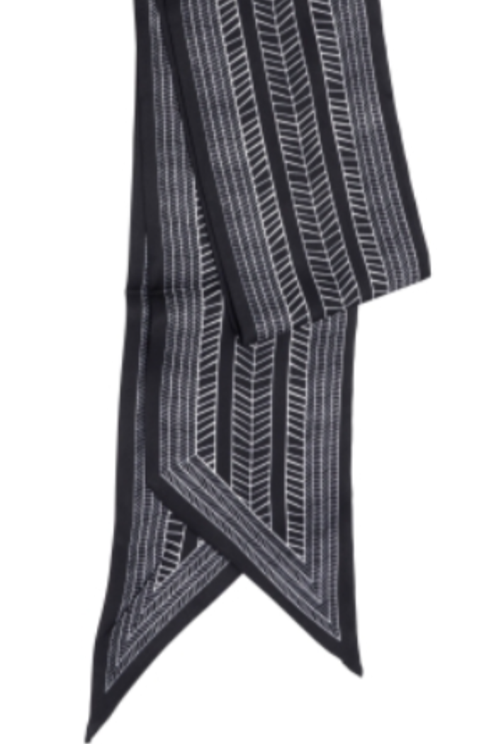 This Black Chevron Double Sided Scarf is a sleek, lightweight wrap with a subtle sheen and a graphic chevron stripe for modern polish. The double-sided construction offers reversible styling options and a long, narrow silhouette that ties or drapes easily. Joy Susan designed this scarf to add a refined finishing touch to both casual and dressier outfits.