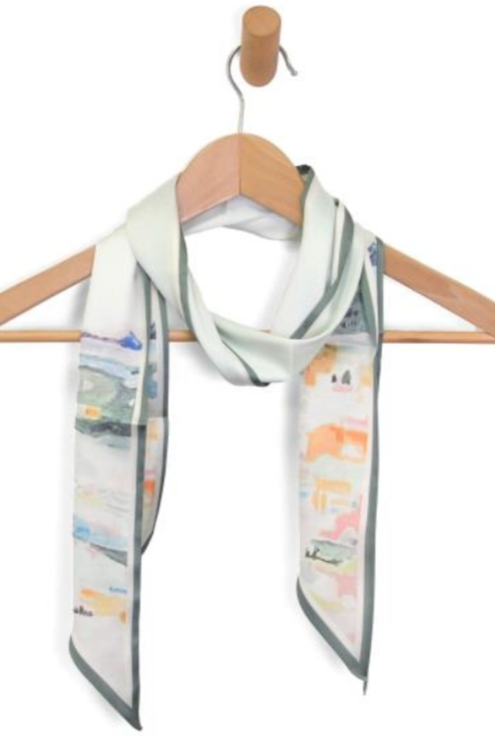 Lightweight and artful, the Multi Landscape Double Sided Scarf adds a painterly accent to any outfit. This double-sided scarf from Joy Susan features a multi‑landscape print with soft color blocking and a narrow, elongated silhouette that can be tied or draped. Its smooth, satin-like finish and rolled edges create a refined accessory perfect for layering over blouses, dresses, or outerwear.