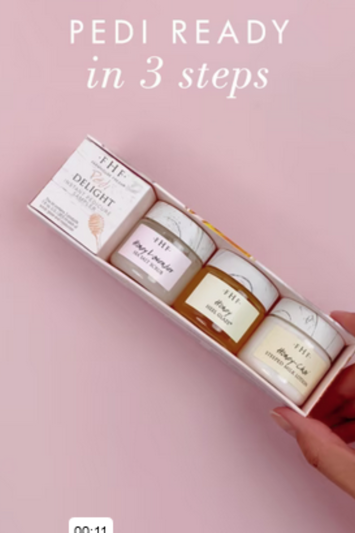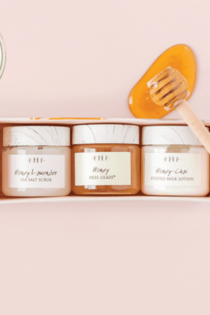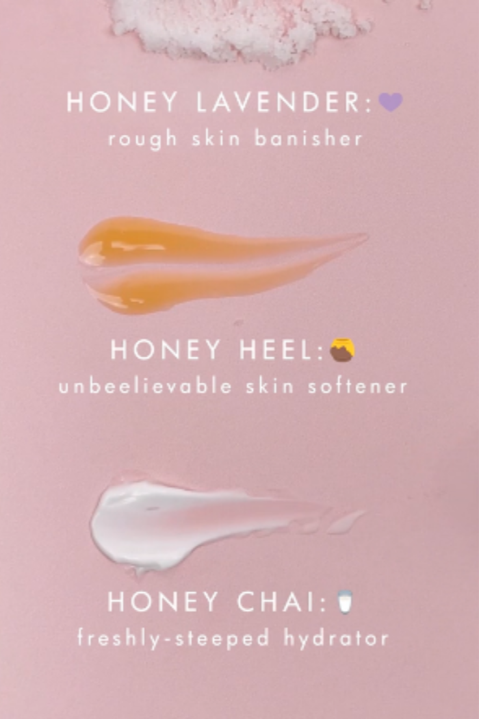 Includes our best-selling Honey Heel Glaze® (Oprah's O-List foot serum made with sweet Texas honey), lightweight Honey Lavender Sea Salt Scrub, and Honey-Chai Steeped Milk Lotion® (a gorgeous, spiced-milk infusion of organic coconut milk and sultry cardamom).