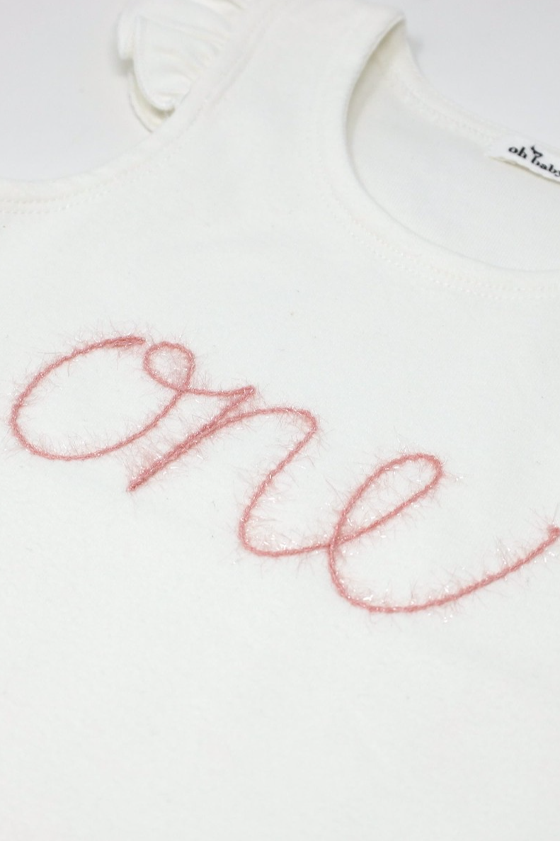 Celebrate her 1st Birthday in style. Appliqued "one" spelled out in pink and gold sparkle yarn on a tank top with flutter sleeves. Add a gorgeous tutu and matching crown for a complete look. Available in size 12-18 mo. Designed in Minnesota.