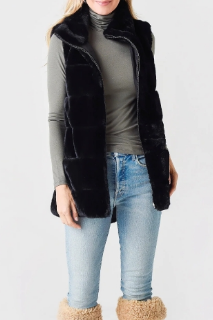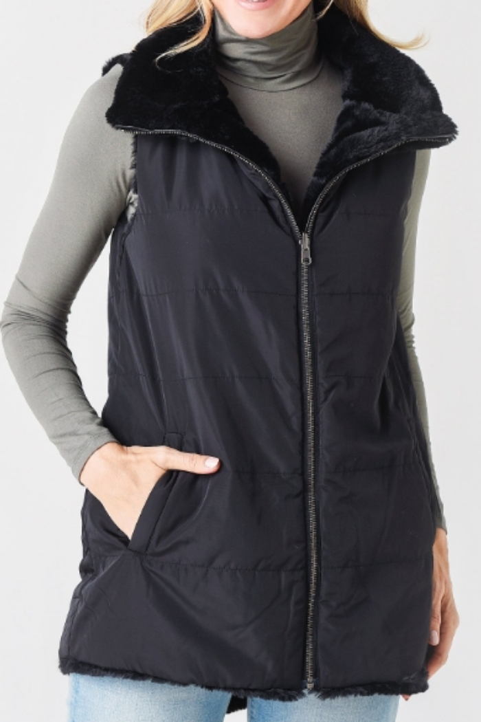 Crafted from plush faux-fur, our reversible Fur Love Vest blends luxe fabric and contemporary style. An effortless vest we love layering thru fall and winter.100% Poly faux fur
