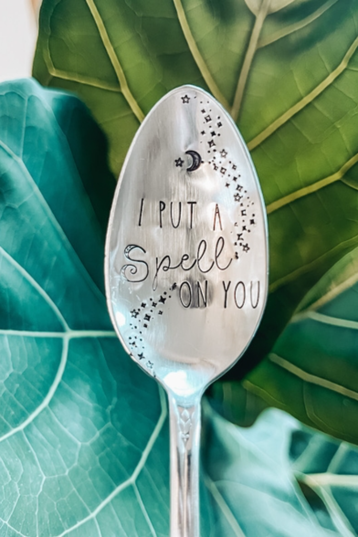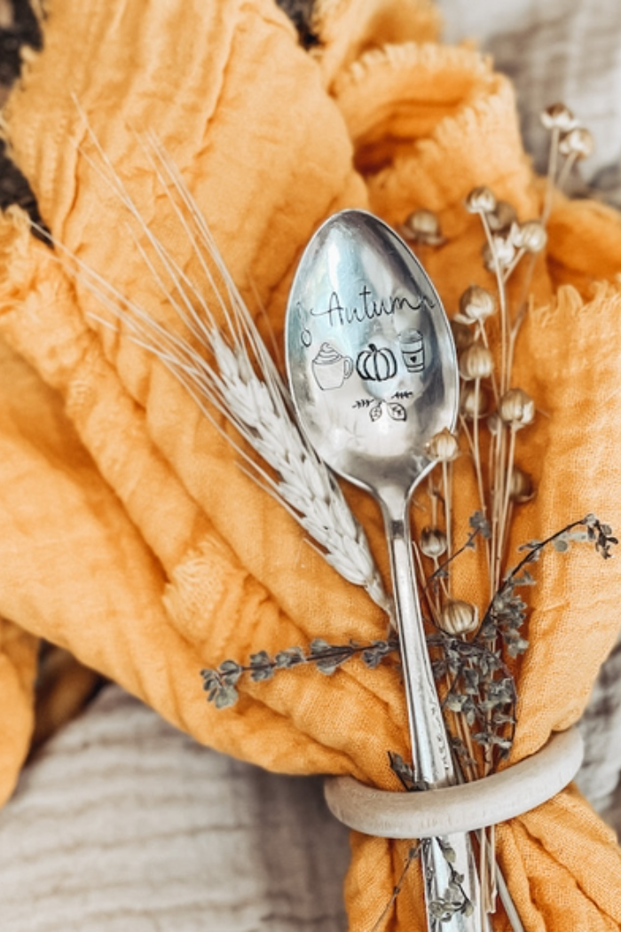 All stamped kitchen accessories are made with vintage silver plated flatware that are found at local antique and vintage thrift stores around town. Each one is stamped by hand, letter by letter.