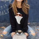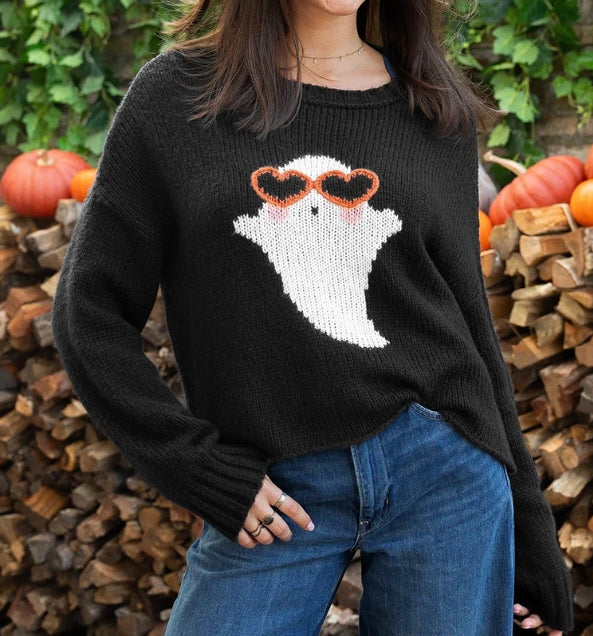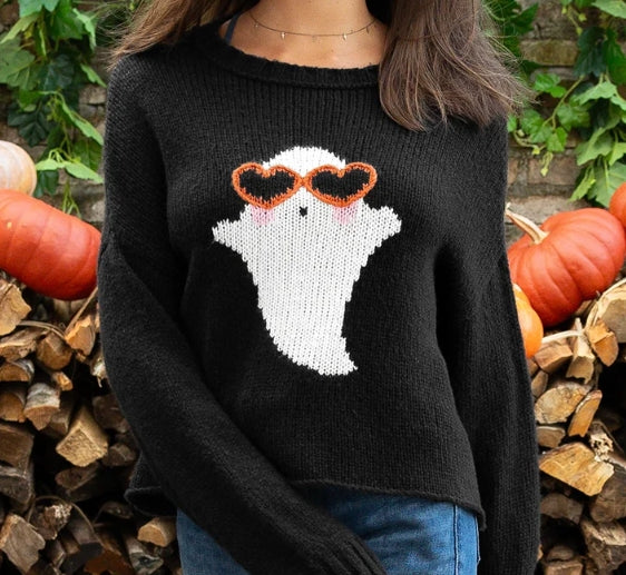 Cute with a spooky twist — the SWEET GHOST CREW features a ghost graphic at the center front, with heart-shaped sunglasses detailed in embroidery for added texture and pop. Crafted in a soft chunky knit, this sweater is finished with a ribbed crew neckline, ribbed cuffs, and a relaxed drop-shoulder fit. A fun pick to bring a little Halloween spirit into your everyday wardrobe.