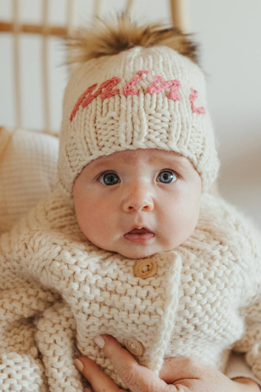 Do you have a mini? This hat says it all with Mini embroidered in Cerise hued yarn. Grab a matching Mama hat too so you can twin with your little one.