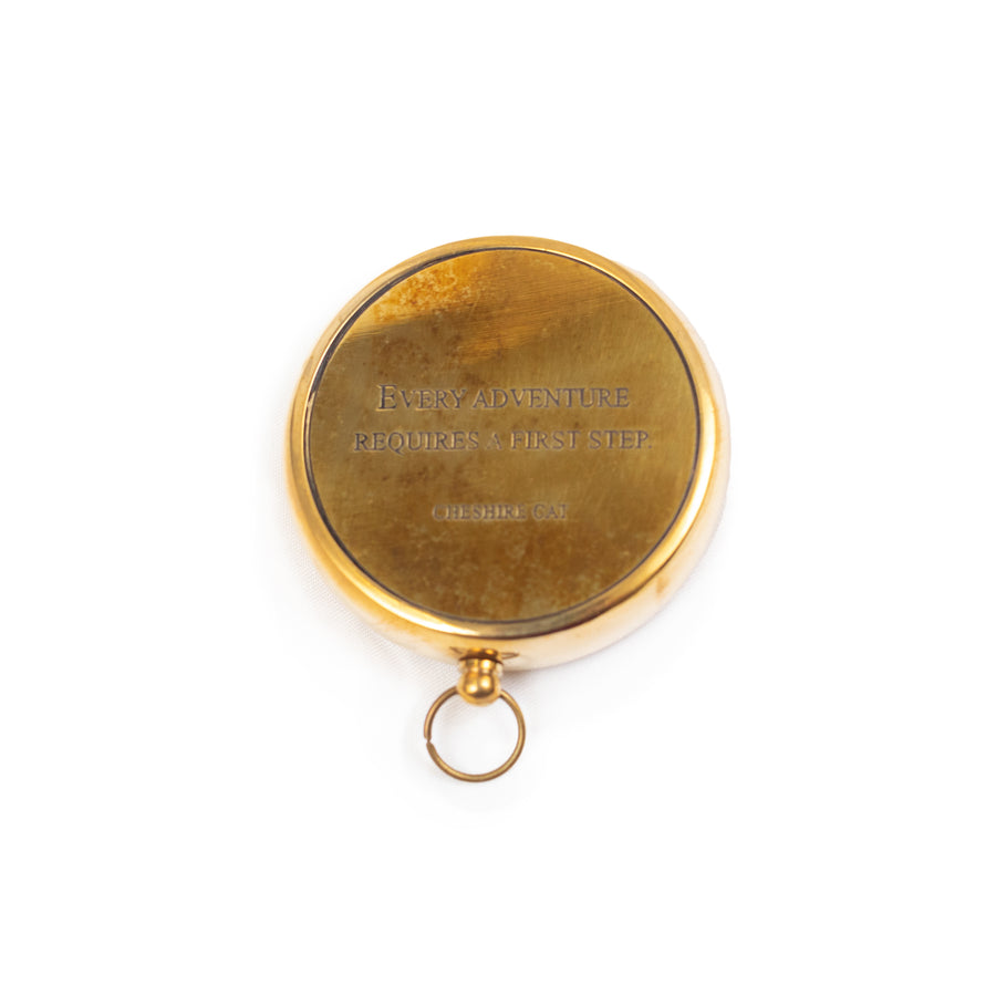 Compass engraved with a Cheshire Cat quote. Comes in a black leather pouch.