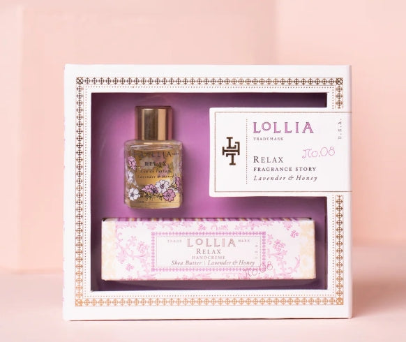Delve into a captivating fragrance story. This chic petite pairing of Eau de Parfum and Shea Butter Handcreme is the perfect introduction to the dreamy Relax fragrance, for yourself or as a gift. A decadent duo, enjoy silky-smooth, delightfully-scented skin. A sublime set for on-the-go luxury.