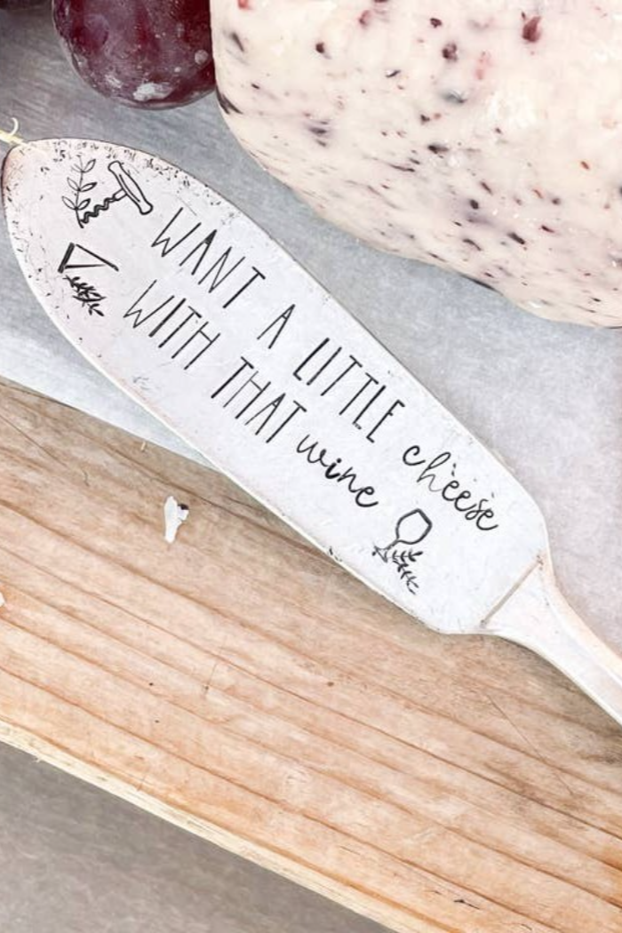 Hand stamped “Want a little Cheese with that wine” knife. This is for ONE knife.