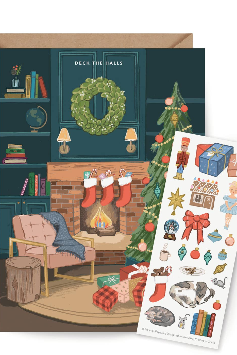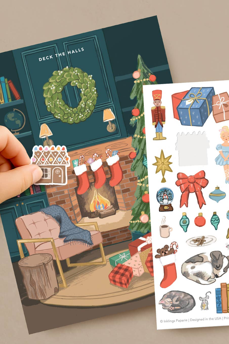 Decorate this cozy Christmas scene! Our Sticker Scene Cards come with an adorable sheet of vinyl stickers to decorate the holiday scene and make it your own. This greeting card is coated with a special finish, making the stickers easy to adjust and reposition again and again! This card is fun for all ages.