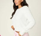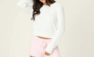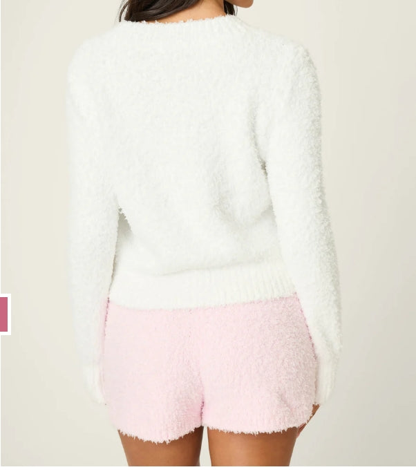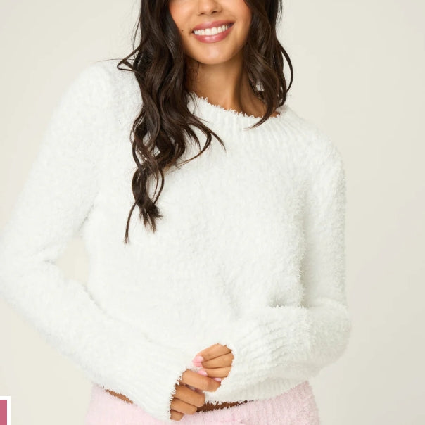 A cozy boucle long-sleeve top with a soft, fuzzy texture and ribbed cuffs and hem. The Bundle Up Boucle Pink Long Sleeve Top from PJ Salvage features a crew neckline and a relaxed fit that layers easily or pairs with the matching bottoms. Perfect for lounging at home or casual days when you want extra warmth and comfort.