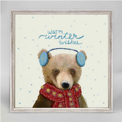 Decorate your home this season with Cathy Walters' sweet portrait of a bear cub dressed in a warm red scarf and blue earmuffs. Miniature versions of our signature canvas wall art are each framed with a rustic wood finish. Our mini art pieces are a delight for interior decorators to set on a shelf or ready to hang on the wall. These can be collected individually, or in a curated series to create a custom gallery wall.