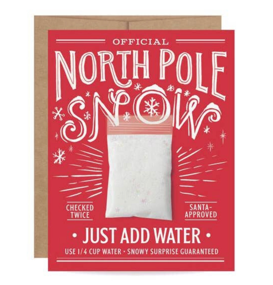 What if you could mail someone a snowball? With our North Pole Snow card, you can! Just add 1/4 cup of water, and be prepared for a snowy surprise. Snow will grow to 100x its size (roughly the size of a snowball). This card is so much fun to send to kids, or to family and friends who live in warmer climates. L 4.5" x W 5.75" x H 0.25"
