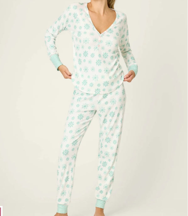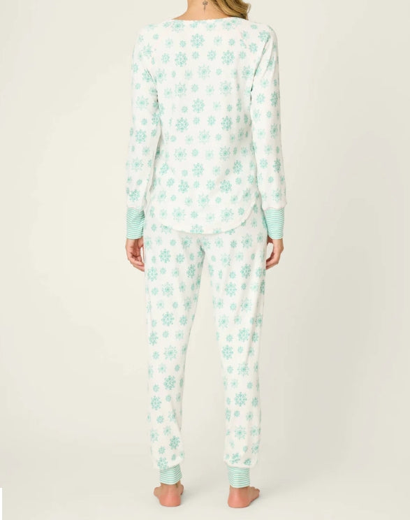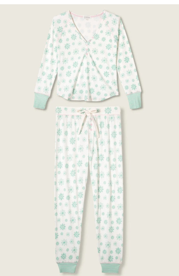 A cozy two-piece pajama set with a snowflake pointelle knit and matching long-sleeve top and jogger-style pants. The Snowflake Wishes Pointelle Pants Set is soft and breathable for relaxed nights and lounging at home. Designed by PJ Salvage, it features ankle-length cuffs and a delicate knit pattern that reads festive yet understated.