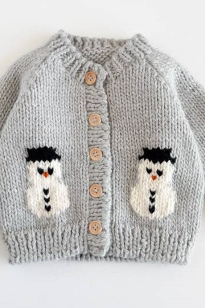 This cozy, pastel blue cardigan features symmetrical snowman design. The cardigan is hand-knit to ensure your little one stays warm and stylish in any winter wonderland.