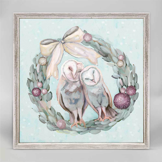 Sweet sleeping owls perched on a holiday wreath by Cathy Walters. Nestled amid ornaments and topped with ribbon, these snuggling mates feel right at home all winter long. Miniature versions of our signature canvas wall art are presented in framed canvases with a rustic wood finish. Our minis are a delight for interior decorators, they can also be collected at home individually, or in a curated series to present on a gallery wall.