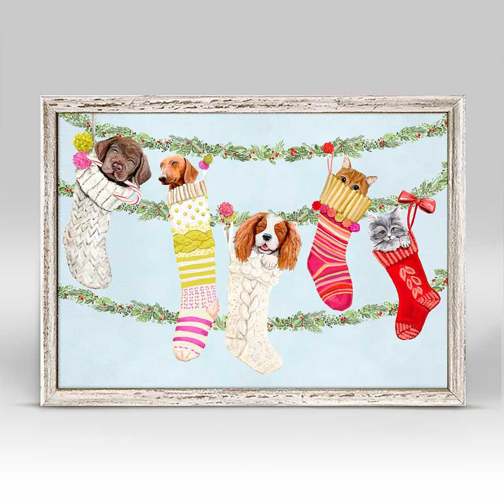 Hang more than ornaments this year with Cathy Walters' merry fur babies dangling from rows of festive garland. Miniature versions of our signature canvas wall art are each framed with a rustic wood finish. Our mini art pieces are a delight for interior decorators to set on a shelf or ready to hang on the wall. These can be collected individually, or in a curated series to create a custom gallery wall.