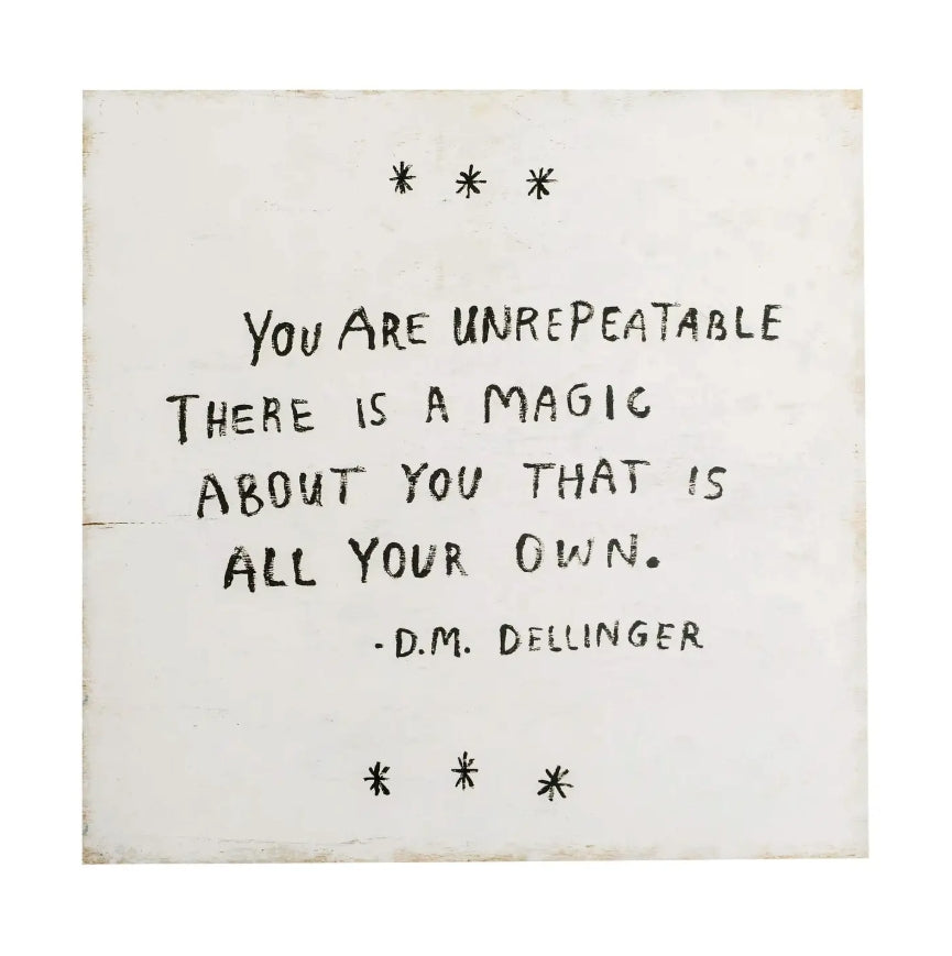 This 12"x12" You Are Unrepeatable (D.M. Dellinger) Art Poster is a square wall print featuring hand-lettered inspirational text on a distressed white background. The piece has a vintage-finish paper look and simple black typography that fits gallery walls, nurseries, or layered shelf styling. Made by Sugarboo & Co, it brings a warm, thoughtful touch to everyday décor.