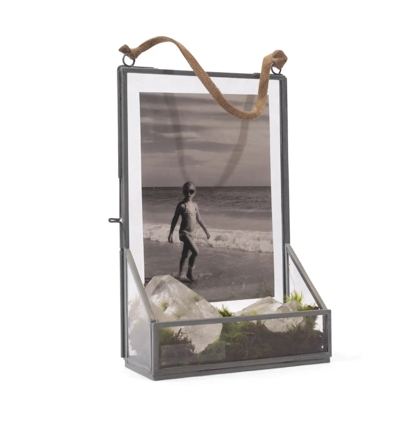 This Hanging Glass and Zinc Memory Box - 8" x 5" x 2" is a hanging display that combines a glass photo frame with a shallow keepsake tray. The zinc frame and clear glass panels let light showcase a photograph above while the lower box holds small mementos. Sugarboo & Co balances vintage-inspired metal detailing with a simple leather hanging strap for an artisanal look. Hang it on a wall or leaned on a shelf to add nostalgic, textured charm to a vignette.