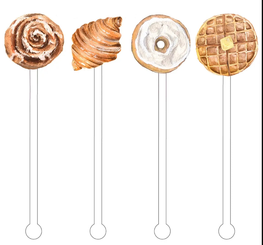 Our Diner Essentials Stir Sticks were made for mornings! Say goodbye to ordinary stirrers and elevate your drink game with these captivating, hand-painted works of art. Our watercolor breakfast carbs stir stick set includes one cinnamon roll, one croissant, one bagel, and one fresh hot waffle with butter. Delish!
