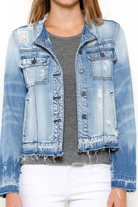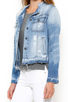 The perfect jacket for a chilly summer night, or a warm winter day. This piece features a button- front closure, four side pockets, heavy distressing, and a frayed hem on a faded light wash. Model is wearing a size Small. Measurements are based on a size Small: Bust 36 ½”. Length 18”