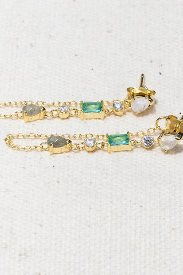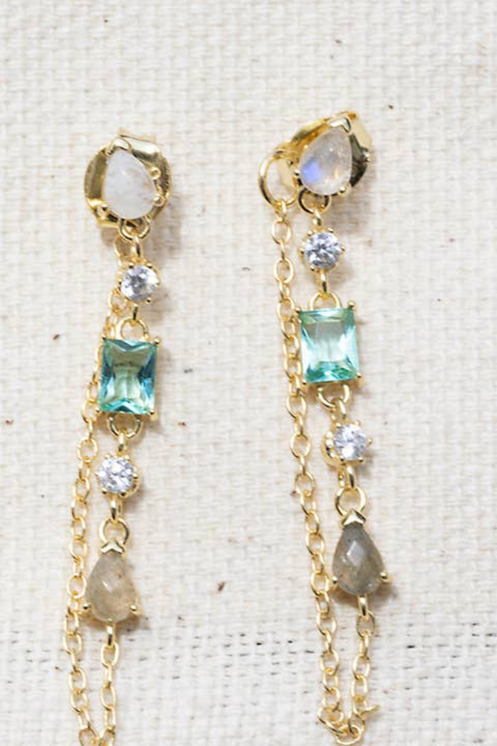 A light delicate chain earring adorned with paraiba cz and labradorite. A delicate and unique design that you won't be taking off! It is made of 14K gold vermeil and measuring approximately 2.5 inches.
