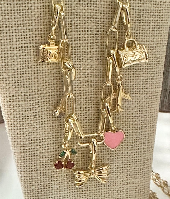 Gold plated paperclip chain bracelet with 7 clicker bail charms.
