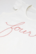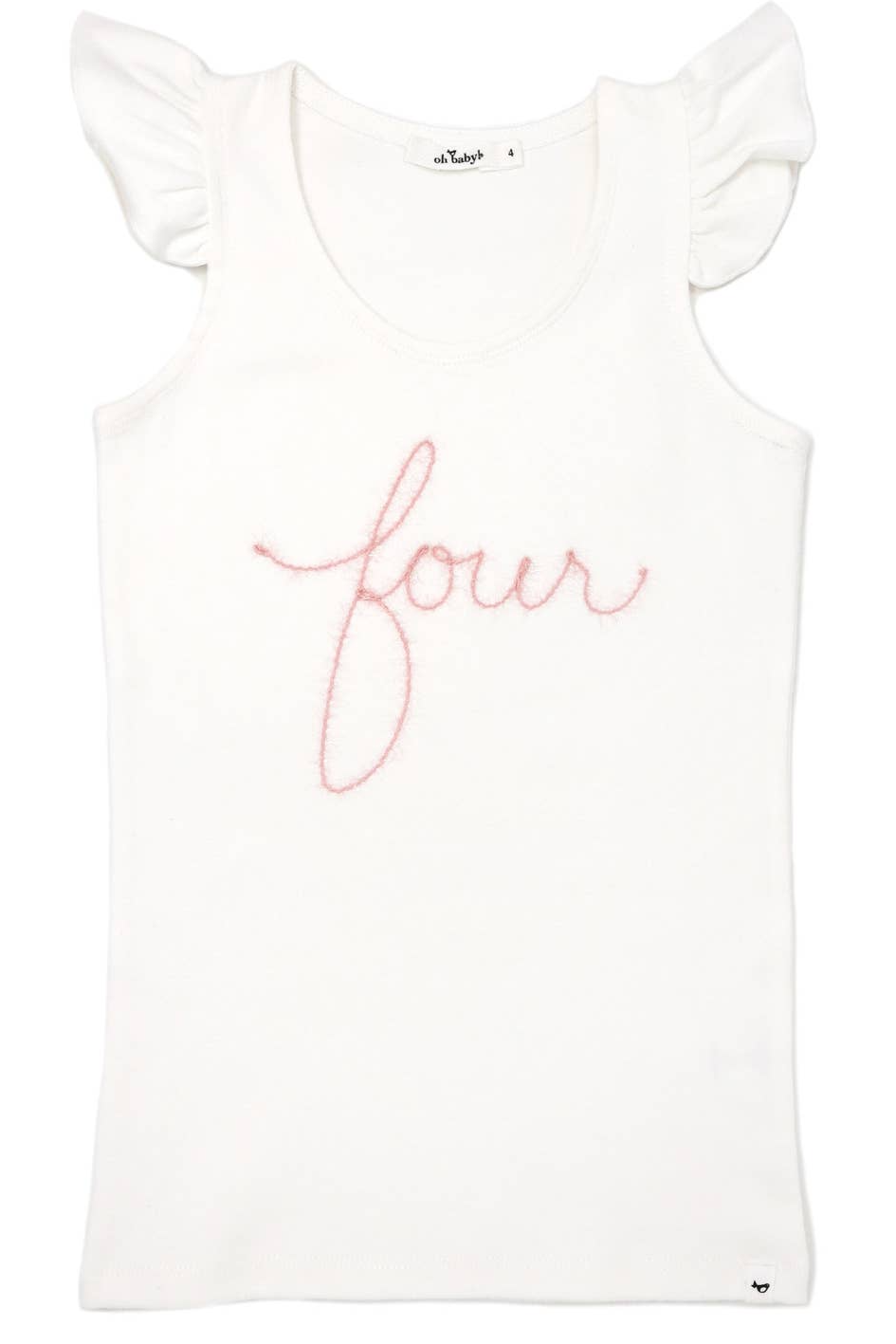 Celebrate her 4th Birthday in style. Appliqued "four" spelled out in pink and gold sparkle yarn on a tank top with flutter sleeves. Add a gorgeous tutu and matching crown for a complete look. Available in size 4. Designed in Minnesota.