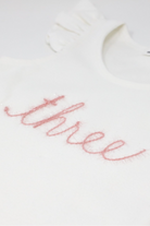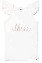 Celebrate her 3rd Birthday in style. Appliqued "three" spelled out in pink and gold sparkle yarn on a tank top with flutter sleeves. Add a gorgeous tutu and matching crown for a complete look. Available in size 3. Designed in Minnesota.