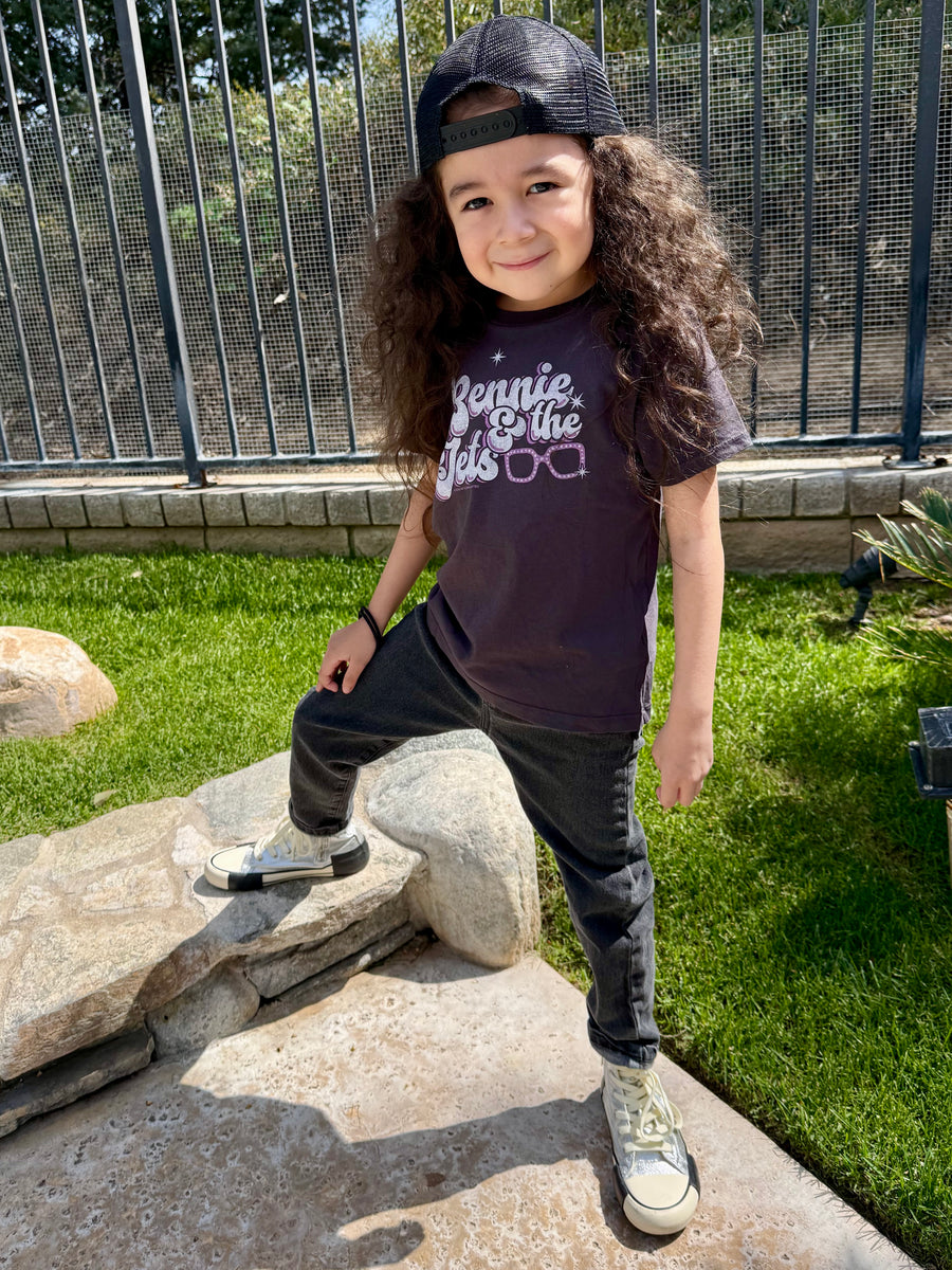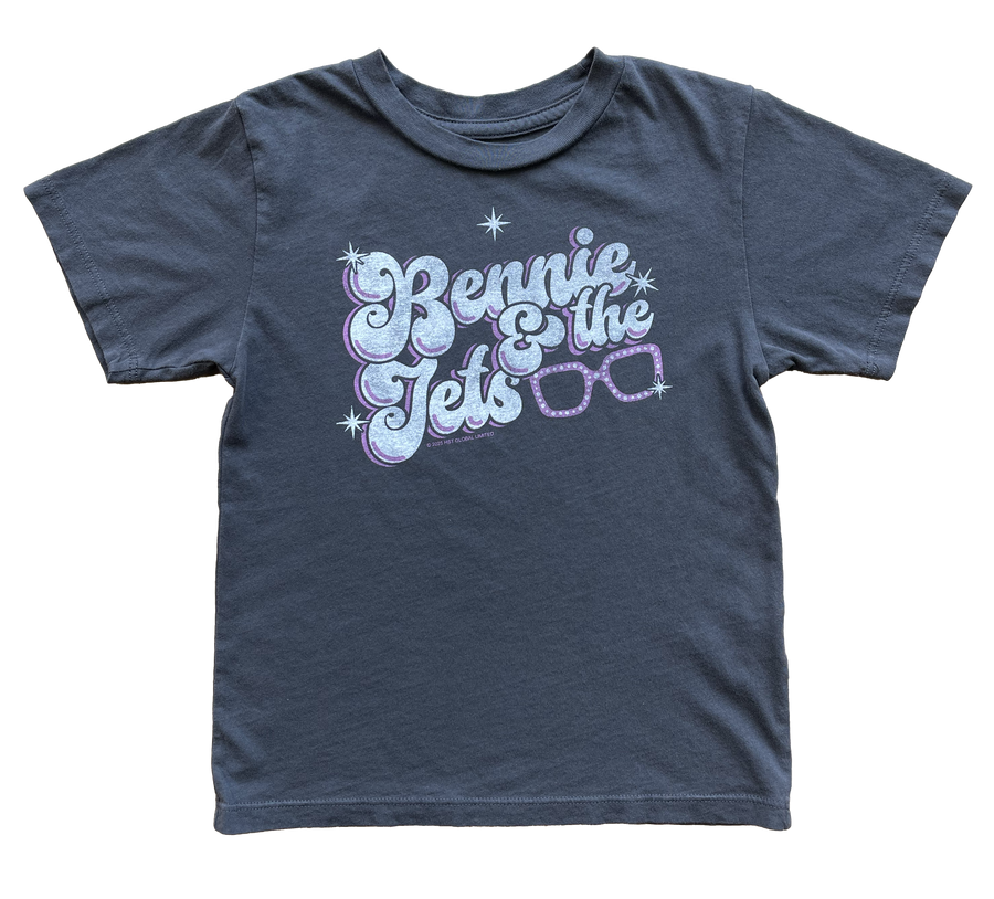 A vintage-inspired graphic tee printed with ‘‘Bennie & the Jets’’ lettering and retro star and glasses accents. The Elton John Bennie and the Jetts Tee is a relaxed, short-sleeve unisex shirt made from soft cotton jersey for everyday wear. Rowdy Sprout brings playful band-inspired styling that layers easily under jackets or pairs with denim for casual outings.