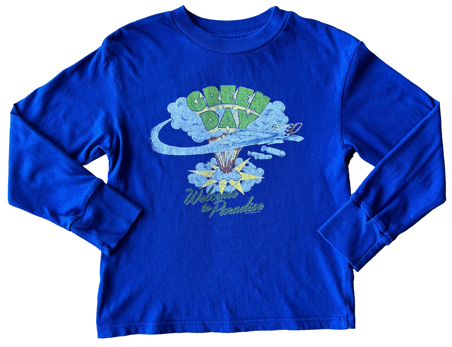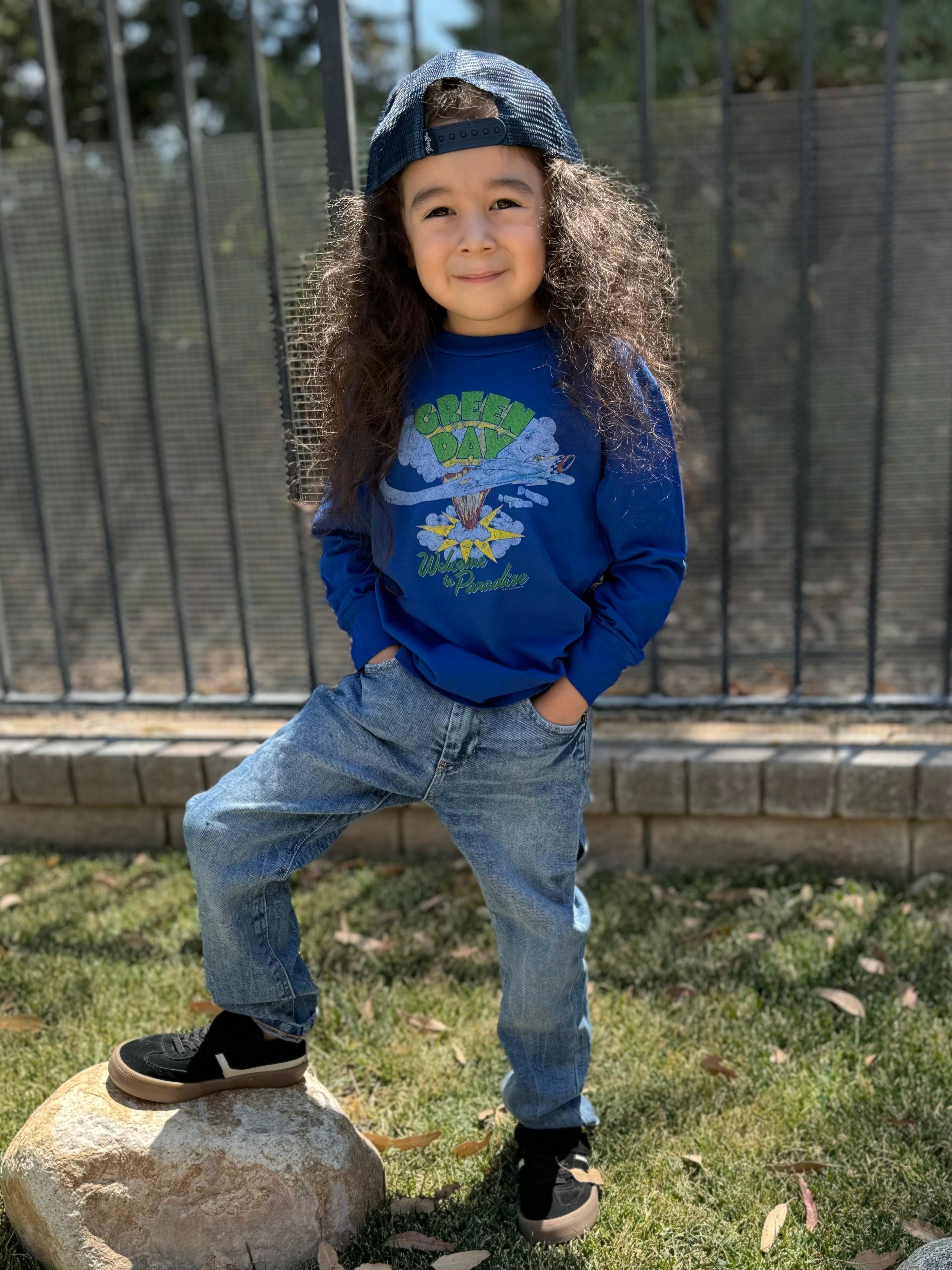A cozy, vintage‑style long sleeve graphic tee printed with Green Day’s “Welcome to Paradise” artwork. This Green Day Welcome to Paradise Long Sleeve features a soft cotton knit, ribbed crewneck and relaxed silhouette for everyday wear. The bold blue color and retro band graphic give it a lived‑in, skate‑inspired vibe perfect for layering. Rowdy Sprout crafted this piece with kid-friendly proportions and durable stitching to stand up to active play.