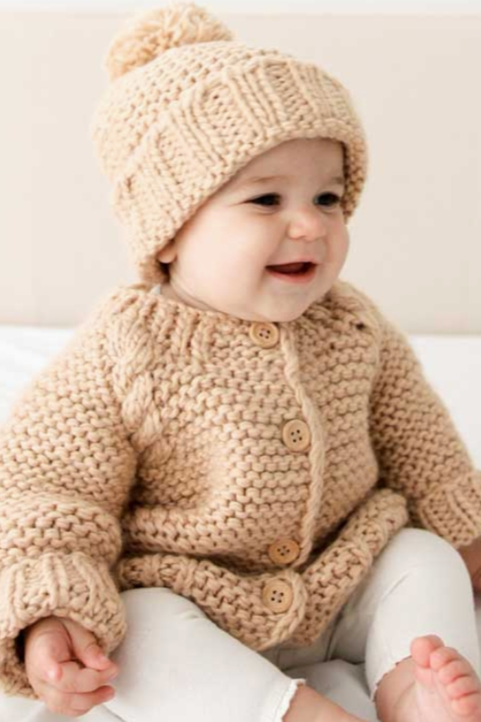 Thick, soft sweater in garter stitch has cable trim raglan sleeves and wood buttons. Hand-knit, in latte colored yarn, it is cozy and warm. The matching knit hat you see here is available separately. What a wonderful gift for any little person you know.
