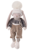 Dressed to impress, Deen is one of our must-have rabbits. His long pants, fuzzy sweater, and pom pom hat will not only keep him toasty during the winter months, but also his lucky companion. He loves to snuggle up near the fireplace and drink hot coco.