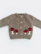 This beautiful sweater is accented with the cutest deep red mushrooms. It's styled with cable trim raglan sleeves and wood buttons. Hand-knit, in pebble colored yarn, it is cozy and warm. We also offer a matching Mushroom knit hat if you want to match this up. What a wonderful gift for any little person you know.