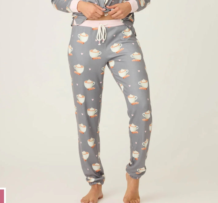 Women’s jogger pants in grey with allover latte cup, cinnamon stick, and heart print. Made from heavy butter jersey with a soft feel and stretch. Features a pink striped waistband, faux fly, and drawstring tie.