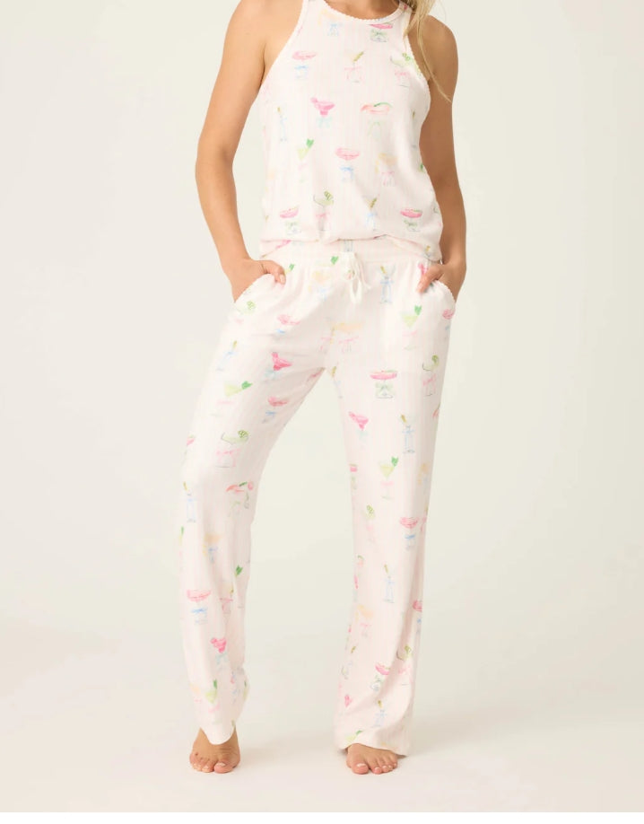 A toast to bedtime, this two-piece PJ set features a racerback tank and full-length pant, both crafted from double-brushed pointelle with an allover cocktail print on a baby-pink and white striped base. The tank has a relaxed, swingy shape with scalloped trim tracing the neckline and back, while the pants are cut with a roomier straight leg, finished with a white drawstring and scalloped-trimmed side pockets. Equal parts soft and sweet, it’s the kind of set worth raising a glass to.