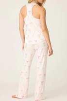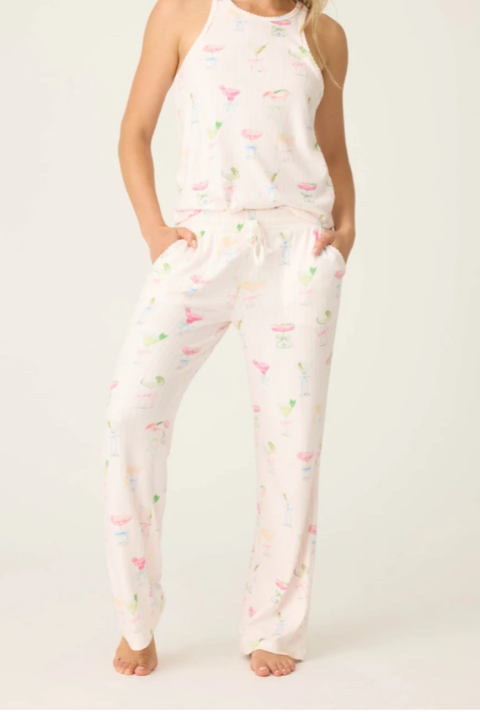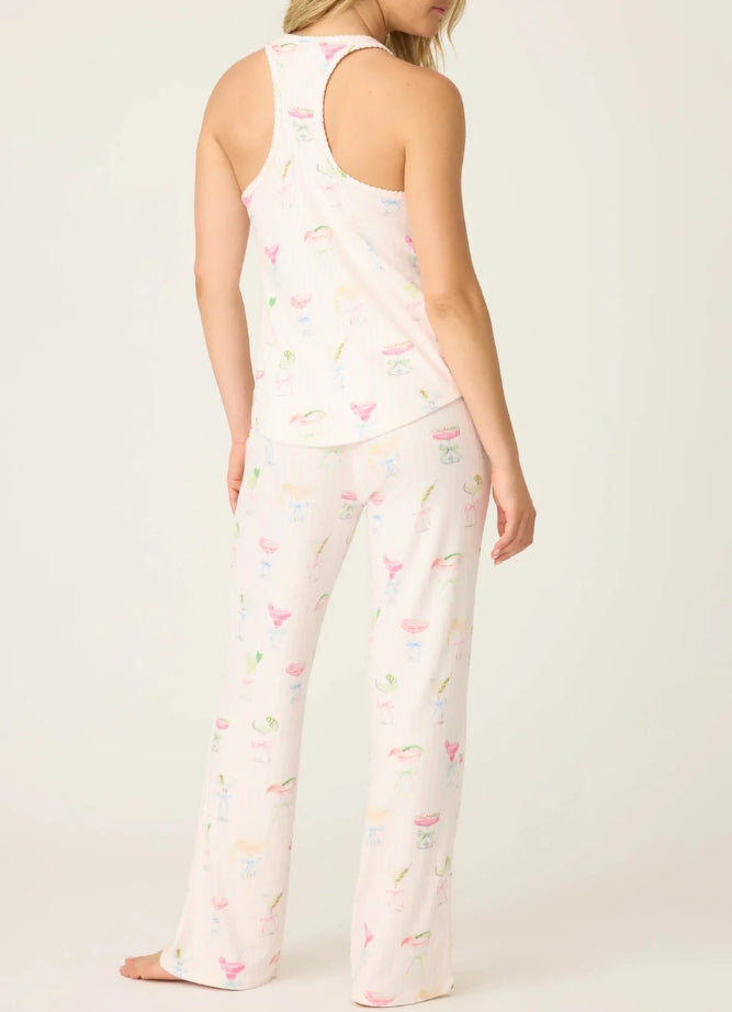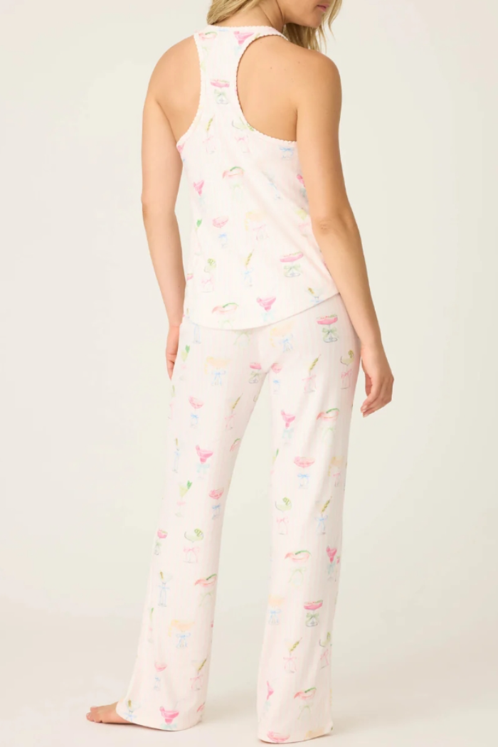 Racerback tank and full-length pants with cocktail print on pink-and-white striped pointelle.