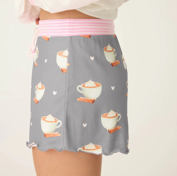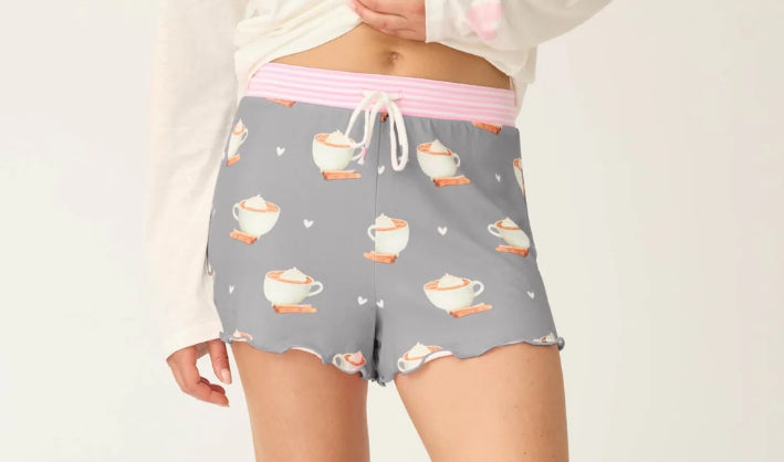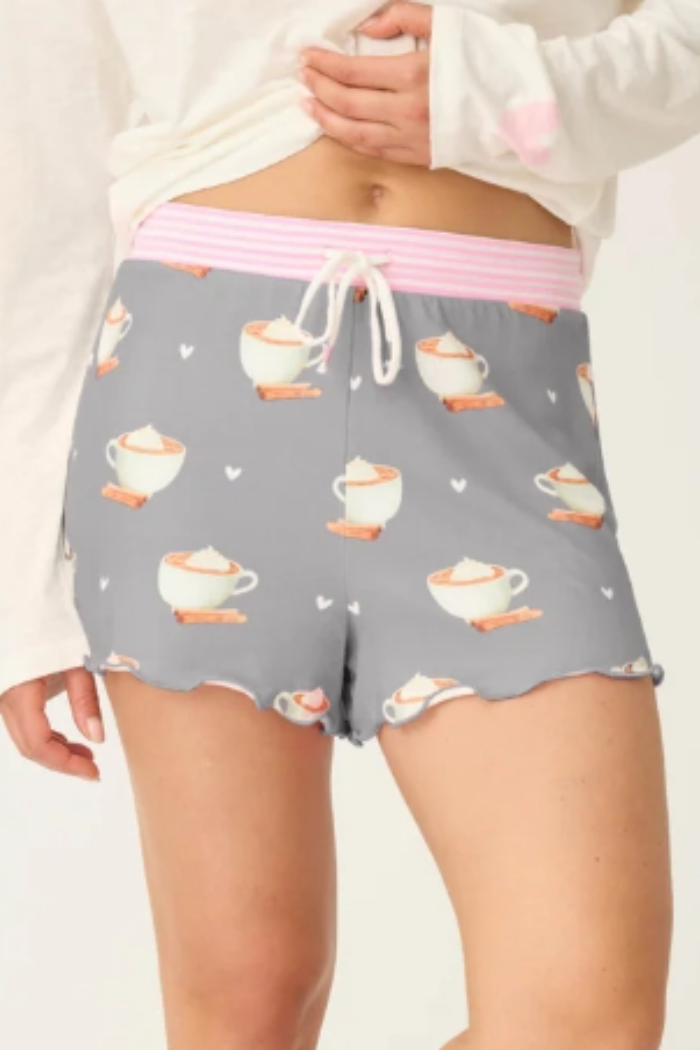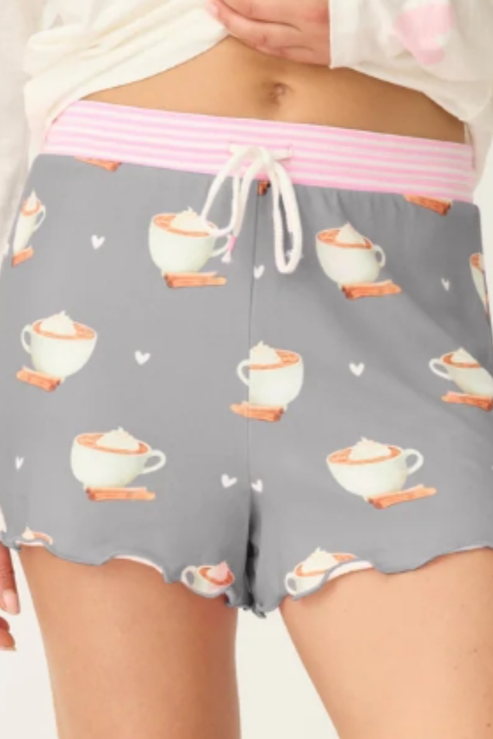 Women’s shorts in grey with allover latte cup, cinnamon stick, and heart print. Made from heavy butter jersey with a soft feel and stretch. Features a pink striped waistband, faux fly, and drawstring tie.