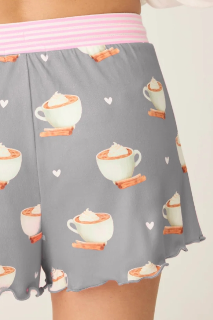 A little cinnamon, a little cream, and a whole lot of cozy. These dreamy butter jersey shorts are sprinkled with latte cups, pink hearts, and swirls of whipped topping—like your favorite morning pick-me-up in lounge form. Finished with a candy-pink striped waistband, they’re sweet from top to bottom.