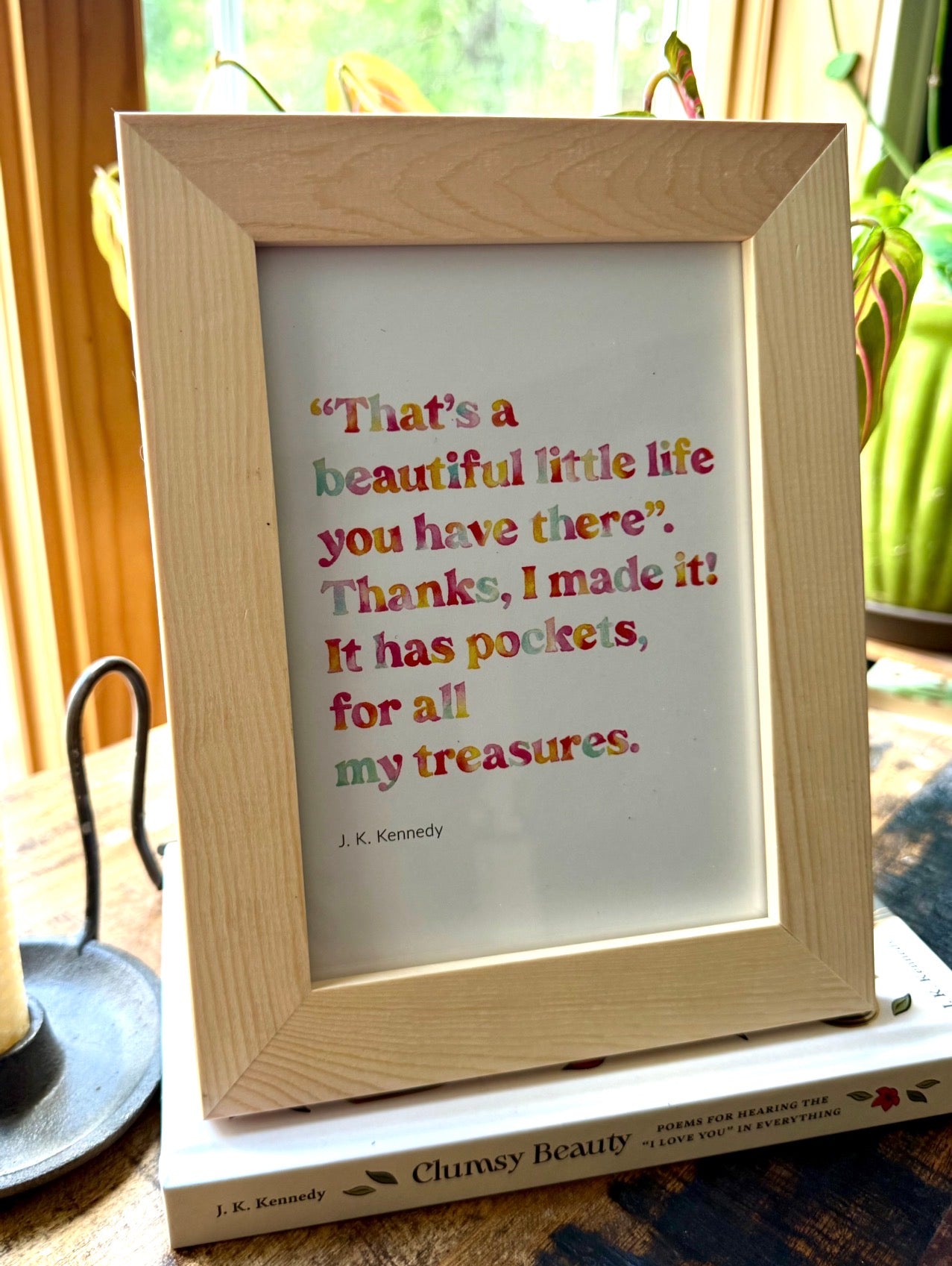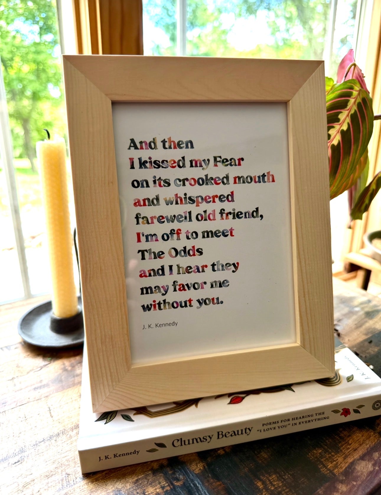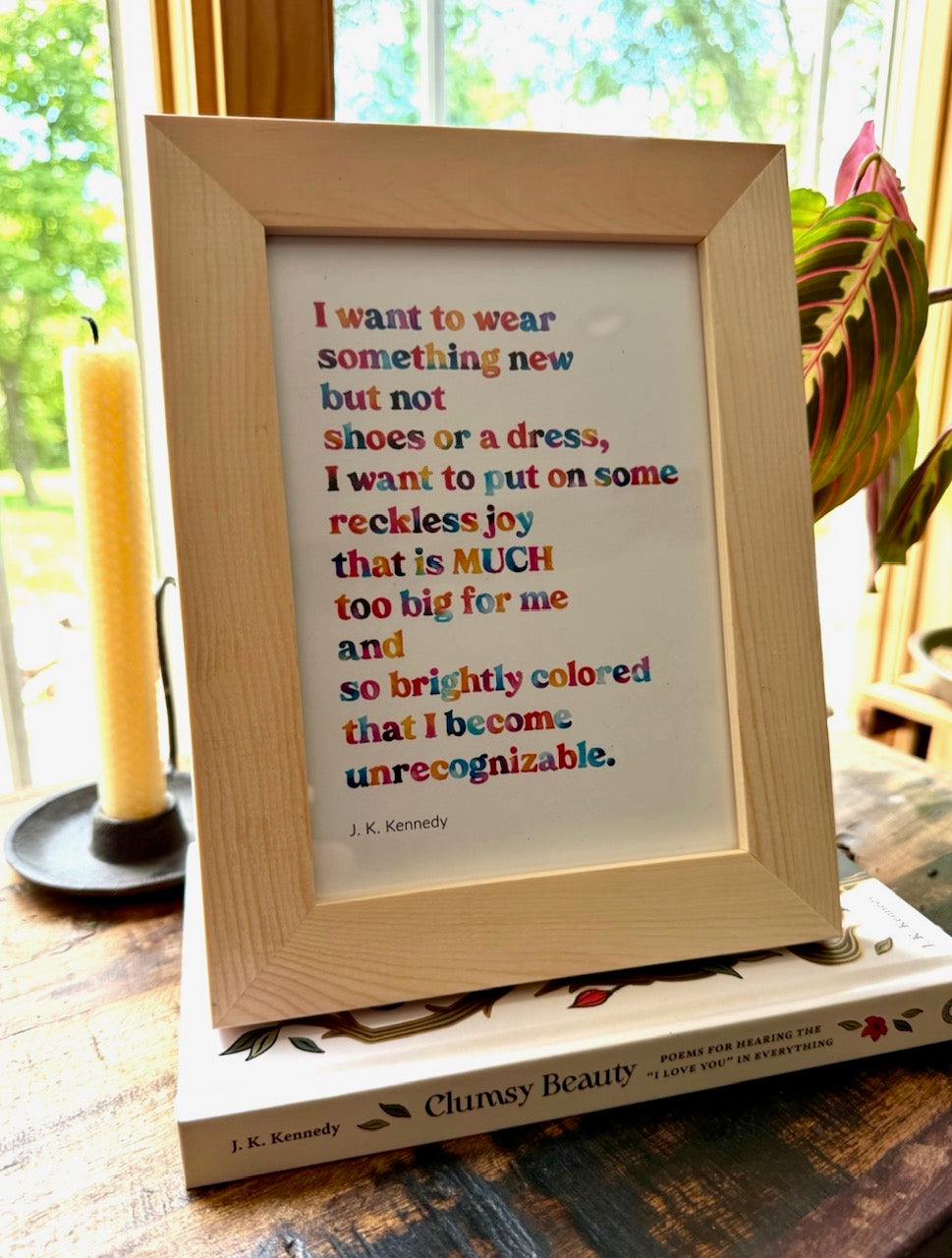 Quote Print - J. K. Kennedy 8x10 multicolored typographic quote on a white background. The piece is from JK Kennedy Writes and shows bold, watercolor-like letters. It sits nicely on a tabletop or shelf and adds a playful, literary touch to a reading nook or office space.