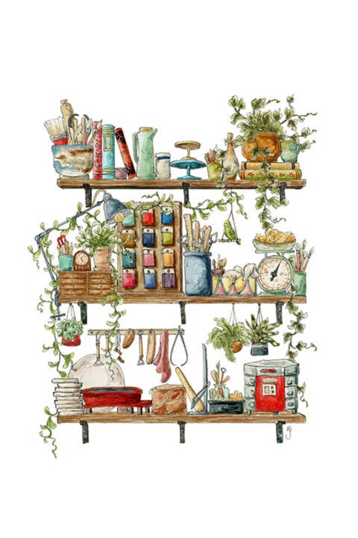 Postcard featuring my original watercolor and ink illustration of the vintage oddities and books tucked away in the shelves of a potter, including glaze test tiles, a tiny kiln, and a bowl of sponges.