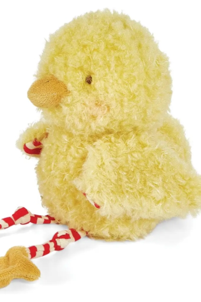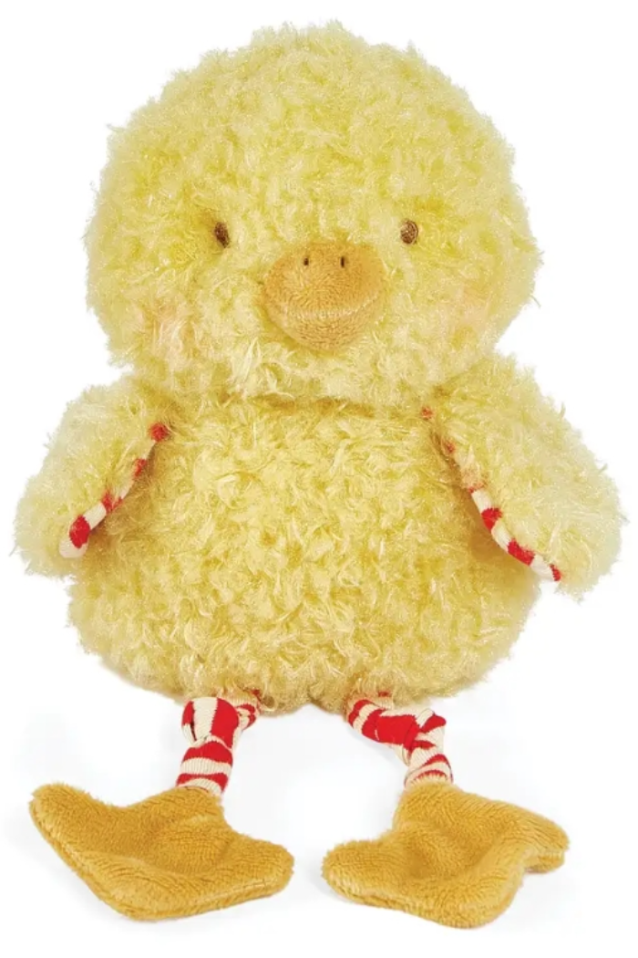 This darling chicken stuffed animal has a shaggy yellow fur body with striped, red & cream knit legs that dangle, and cute orange feet and beak for an extra pop of fun and color. Clucky's hand-embroidered eyes are safe for even the littlest of farm animal friends.