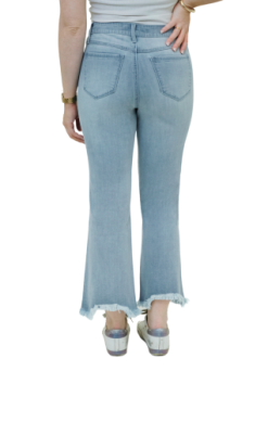 Meet Chase, our new mediumish-lightish wash for Spring, on our all time best-selling body, our demi boot. The frayed hem truly flatters your frame no matter your height and adds some extra fun detail to finish your outfit. These are crafted from Tencel for a super soft breathable fabric with the perfect amount of stretch. Features the super on trend SharkBite hem with the perfect length to wear booties or sneakers! • Rise: 10.5" • Leg Opening: 19" • Inseam: 27" C88C2153H5-47C Wash Name- Chase • Care Options: Machine washable, Hand wash, Dry clean, Spot clean, Wipe clean, Machine Wash Cold • Closure: Zipper • Pockets: 2 front pockets, 1 coin pocket, 2 back pockets • Features: shank, rivets, 1822 charm