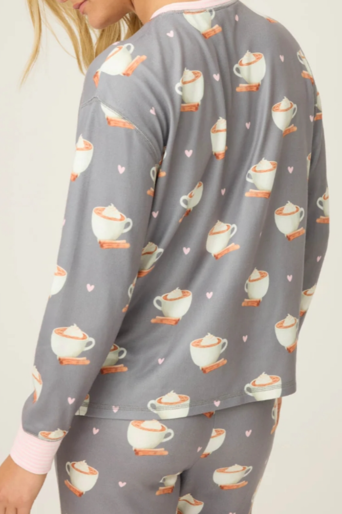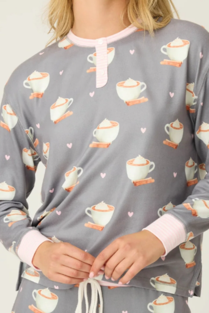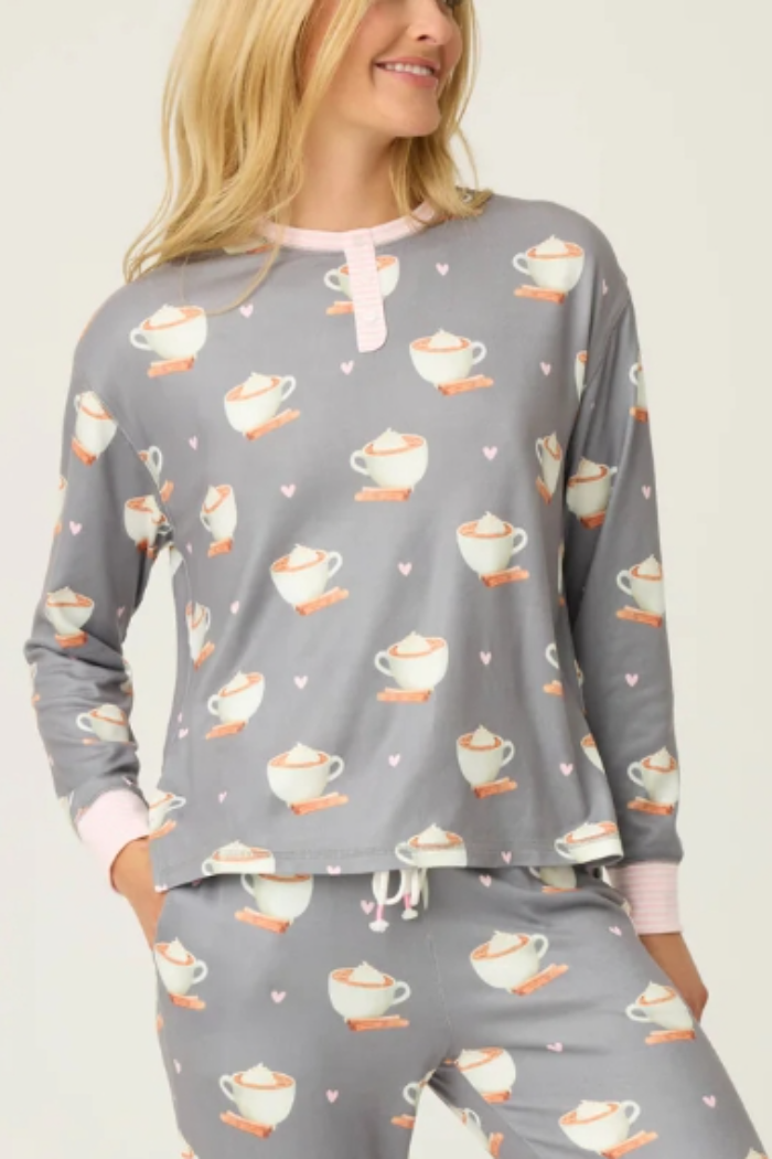 A little cinnamon, a little cream, and a whole lot of cozy. This dreamy butter jersey long sleeve top is sprinkled with latte cups, pink hearts, and swirls of whipped topping—like your favorite morning pick-me-up in lounge form. Finished with a candy-pink striped collar, faux button placket, and cuffs, it’s sweet from top to bottom.