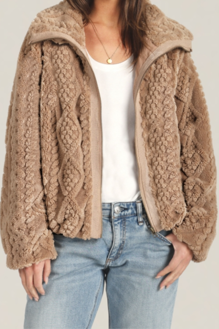 Super-soft, chunky cable knit, lined waist-length jacket with zipper front