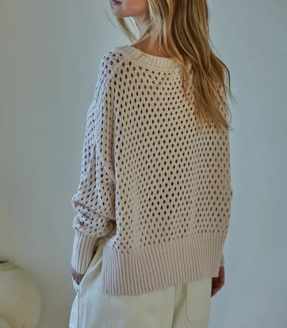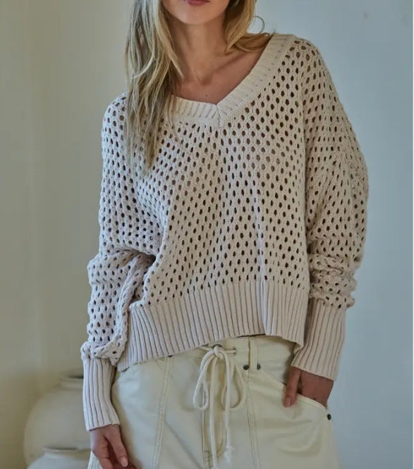 Knit Sweater Cotton See-Through V-Neck Long Sleeve See-Through Pullover Top