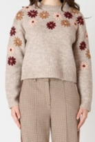 Cute crewneck sweater in brown tones with floral appliques around neck & sleeves