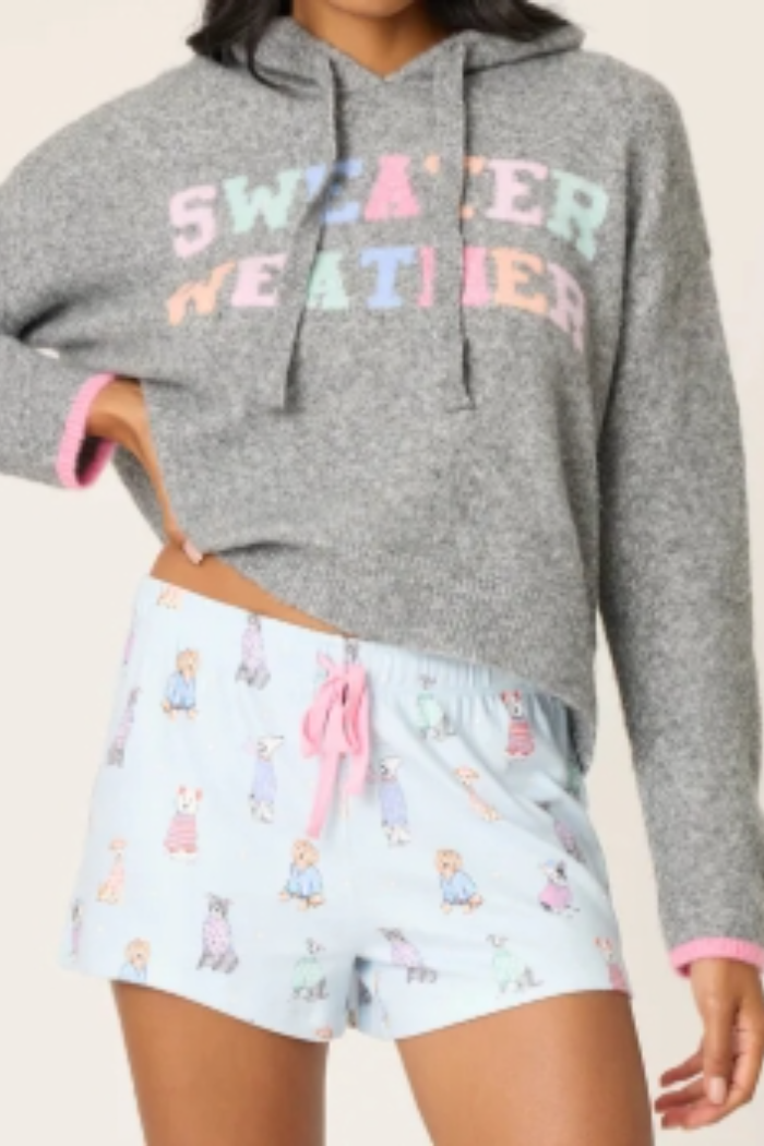 Meet your new lounging favorite. This sweater knit is soft yet structured, featuring a drawstring hoodie with a relaxed fit and banded cuffs. In a light charcoal with pastel lettering, it’s a cozy essential that doubles as a festive layer for the holiday season.