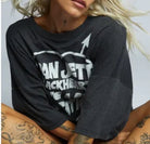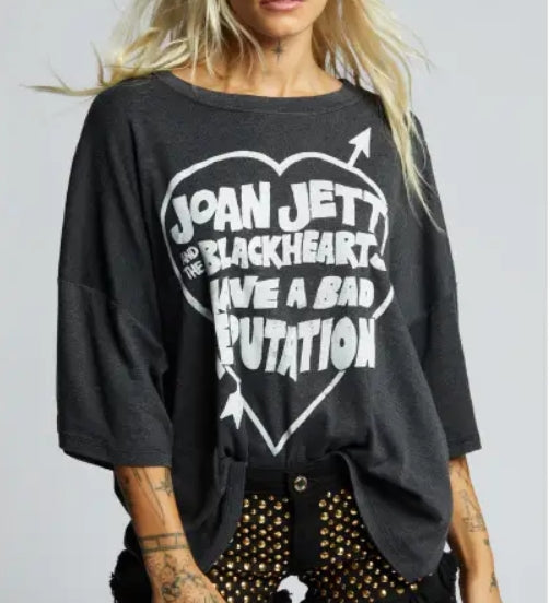 The Joan Jett Bad Reputation One Size Graphic Tee is an oversized, slouchy graphic top printed with a bold Joan Jett heart motif. It’s crafted from a soft jersey cotton-blend that drapes for an easy, lived-in feel. This Recycled Karma tee features a wide scoop neckline and 3/4 sleeves for a relaxed, edgy look perfect for casual everyday wear.