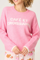 Women’s bright pink crewneck sweater with “Café Et Croissants” text graphic in boucle embroidery.