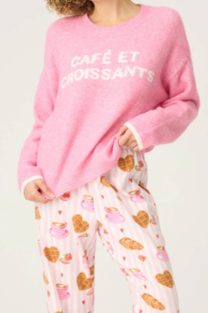Playful and très cozy, this bright pink sweater is a soft nod to your dream Parisian breakfast. Crafted from our fuzzy snuggle knit with a boucle “Café Et Croissants” graphic, it’s the ultimate layering piece for croissant runs, coffee dates, and slow weekend mornings.