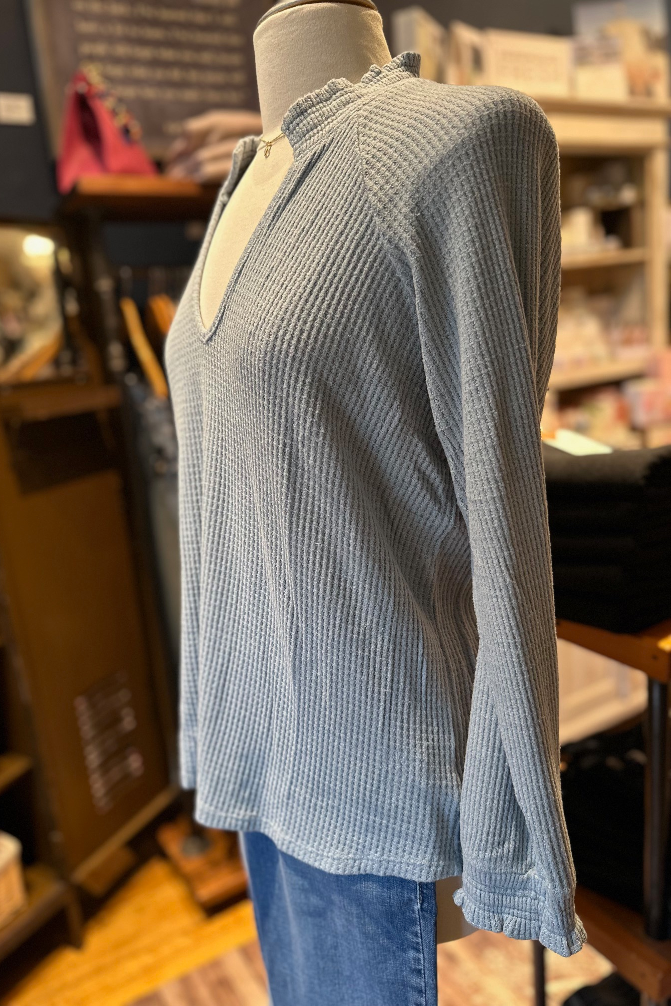 Comfortable Waffle knit V-neck top with shirred elastic at the neck & cuffs